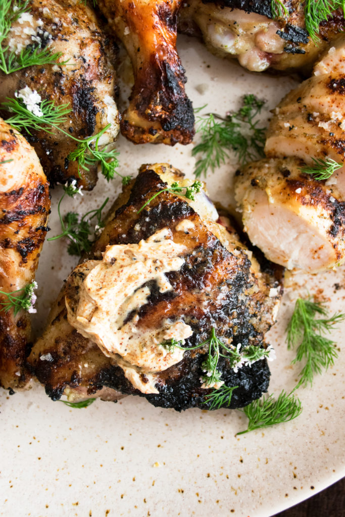 The marinade of garlic, dill, salt, lemon, and oil really does all the work here…creating juicy grilled chicken that’s bursting with garlic flavor. The paprika butter is the special touch, hinted with just a bit of cayenne pepper, and slathered on top of the hot chicken right off the grill.