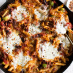Spread the pasta into an even layer. Top with the slices of fresh mozzarella (season each slice with a pinch of salt) and the shredded mozzarella. Bake for 6 minutes until the cheese has melted. Turn the oven temp to high broil. Broil for 1-2 minutes until the cheese is golden brown. Garnish with a pinch of crushed red pepper if you’d like.