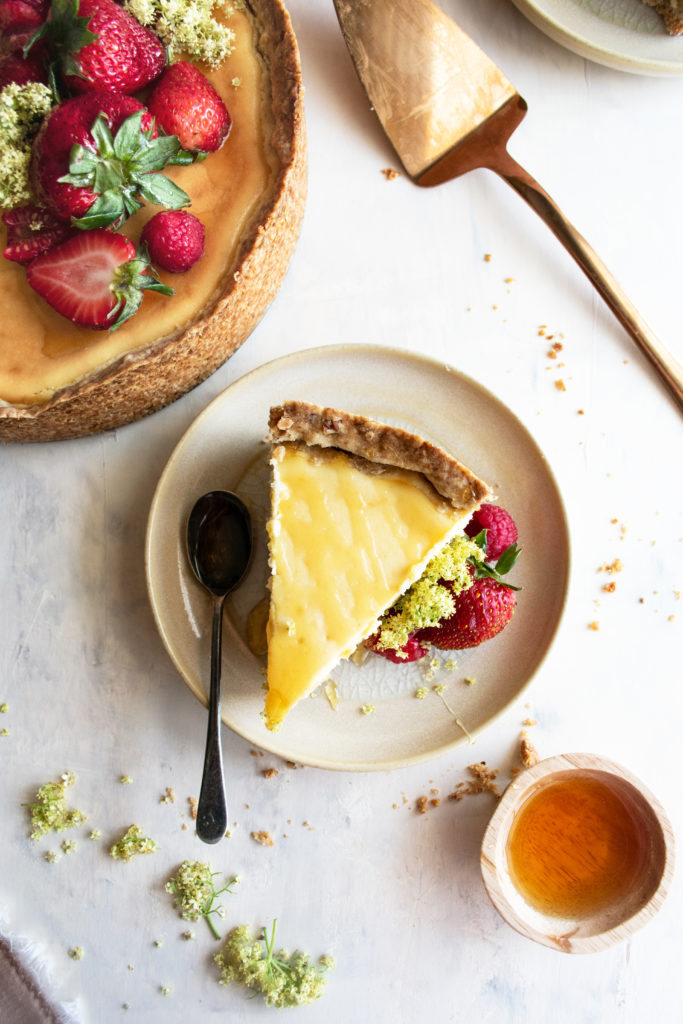 - Remove the cheesecake from the springform pan and cut into slices. Serve with any topping you’d like (fresh fruit, a cooked & cooled fruit topping, honey, etc.).