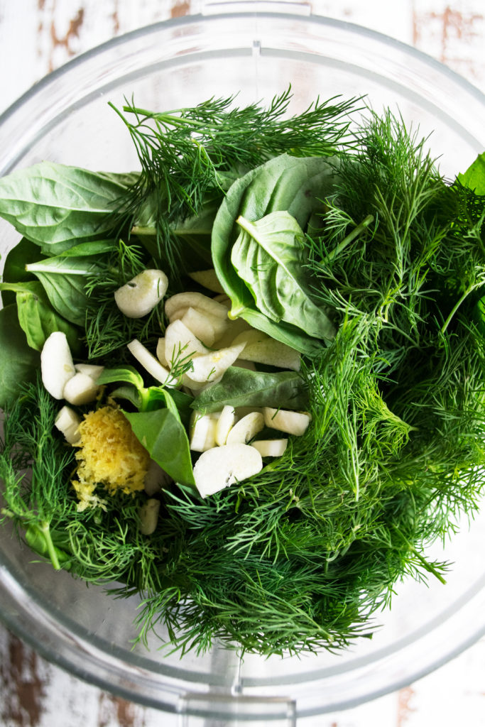 - Combine the spinach, basil, dill, and garlic in a food processor. Pulse to combine.