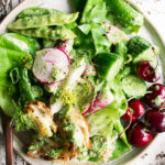 Your new go-to summer garden green goddess salad. Fresh butter lettuce, snap peas, radishes, cucumbers, scallions, cherries, and torn croutons. All combined with a vibrant green goddess dressing. It’s refreshing and simple. Just the perfect salad to add on to any summer menu.