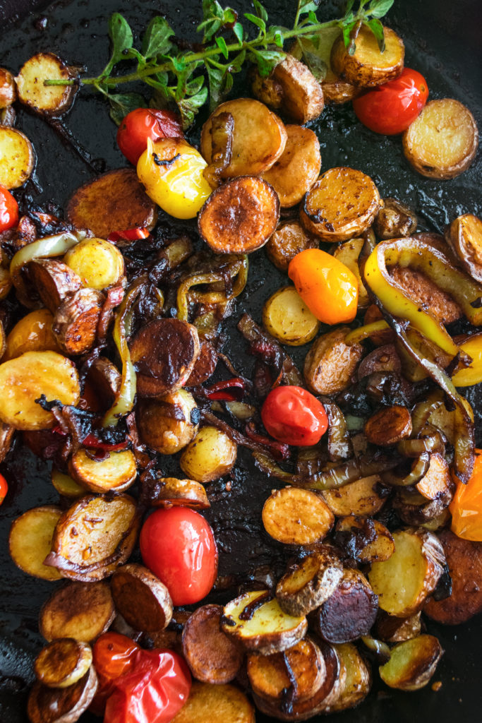 A fun Mexican potato hash to spice up your breakfast routine! Crispy fingerling potatoes, spicy peppers, juicy summer cherry tomatoes, and bold Mexican spices. Topped with fried eggs, avocado, and a quick lime yogurt sauce. It’s a simple and healthy, yet extremely flavorful, egg dish for when you need to mix things up.