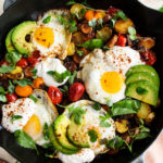 Serve the potato hash with 4 fried eggs on top, a few big dollops of yogurt sauce, the sliced avocado, and fresh cilantro to garnish.