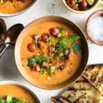 - Serve the gazpacho with the cherry tomato topping spooned over top. Garnish with more fresh basil, a pinch of flaky sea salt, and black pepper. Serve the grilled bread alongside.