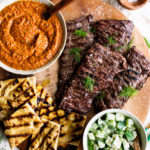 A steak dinner fit for summer – simply grilled skirt steak with romesco sauce (a Spanish tomato-based sauce that is incredibly flavorful), plus yogurt-marinated cucumbers and grilled flatbread. It’s a recipe full of bold & refreshing flavor, and honestly just so delicious. You can make this for a fun weekend night at home and feel like you’re at your favorite Spanish restaurant!