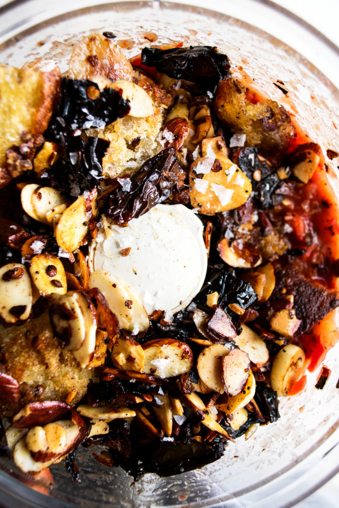 Since you’ll have the grill on for the skirt steak, I recommend just toasting the bread/nut mixture in a cast-iron skillet over the grill instead of using the stovetop. You’ll sizzle the garlic, bread, almonds, and chiles in hot olive oil until nice and fragrant. You’ll blend everything up in the food processor…resulting in a vibrant red sauce that is SO good over the grilled meat.