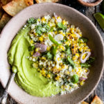 a creamy avocado dip flavored with lime, jalapeño, and garlic, topped with a simple grilled corn salad, and served with tortilla chips