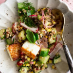 Sharing a really unique pan-fried paneer salad today! Full of toasted grains, summer cucumbers & corn, a simple vinegar and oil dressing, and lots of fresh herbs. It’s hearty and satisfying, yet really light and crisp. Perfect light lunch or dinner side dish!