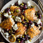 crispy pan-roasted chicken topped with a caramelized mixture of grapes, lemon, shallots, and olives, topped with pistachios and feta cheese