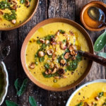 a creamy, savory roasted pumpkin soup with a vibrant hazelnut & honey sage pesto drizzled over top