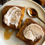 While the maple pumpkin bread bakes, you’ll whip up some softened butter with cinnamon & maple syrup to create a decadent topping for the bread. A little goes a long way, but it’s the perfect thing to swoosh right on top. Trust me, don’t skip the butter! The recipe calls for 2 sticks, so any leftover you might have is amazing on toast or just about anything you’d like.
