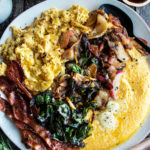 What could be better as a weekend breakfast than a fall-inspired polenta breakfast platter with scrambled eggs, crispy bacon, melted apples, and wilted greens?! The polenta is full of cheddar cheese and each bite has flavors of sage and maple running throughout. It’s hearty and comforting, best served with a hot cup of coffee alongside on a very slow, relaxing crisp fall morning!
