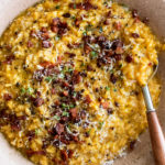 The most delicious, seasonal pumpkin risotto – full of fresh thyme, white wine, a little butter, honey for some sweetness, lots of parmesan cheese, and topped with crispy bacon & black pepper. It is the perfect side dish for any meal this time of year!