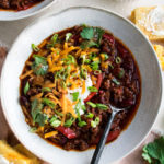 And of course…chili would be nearly as good without lots of toppings. I like a dollop of sour cream, lots of cheddar cheese, a little cilantro, and a palmful of sliced scallions. But really, use whatever toppings you’d like!