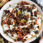 A fun, simple appetizer to start off your Thanksgiving feast! Creamy whipped goat cheese topped with a caramelized mixture of dates, shallots, vinegar and honey, with bacon and fried rosemary crumbled over top. You can serve this just like a dip, with either toasted bread or crackers for dipping. Kind of a spin on the classic “bacon wrapped dates” that everyone loves to bring to a party. It’s bold, flavorful, and such a beautiful dip to serve for any fall or winter holiday.