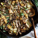 This stuffing recipe is a little untraditional, but extremely delicious. It almost comes together more like a savory bread pudding. You’ll toast off some brioche bread until golden and crisp. The brioche adds a rich, buttery flavor that’s slightly sweet…which works perfectly with the mushrooms. A mixture of onion, celery, garlic, butter, and herbs gets caramelized in a skillet, then it all is mixed up with eggs, vegetable stock, and pan-roasted mushrooms.