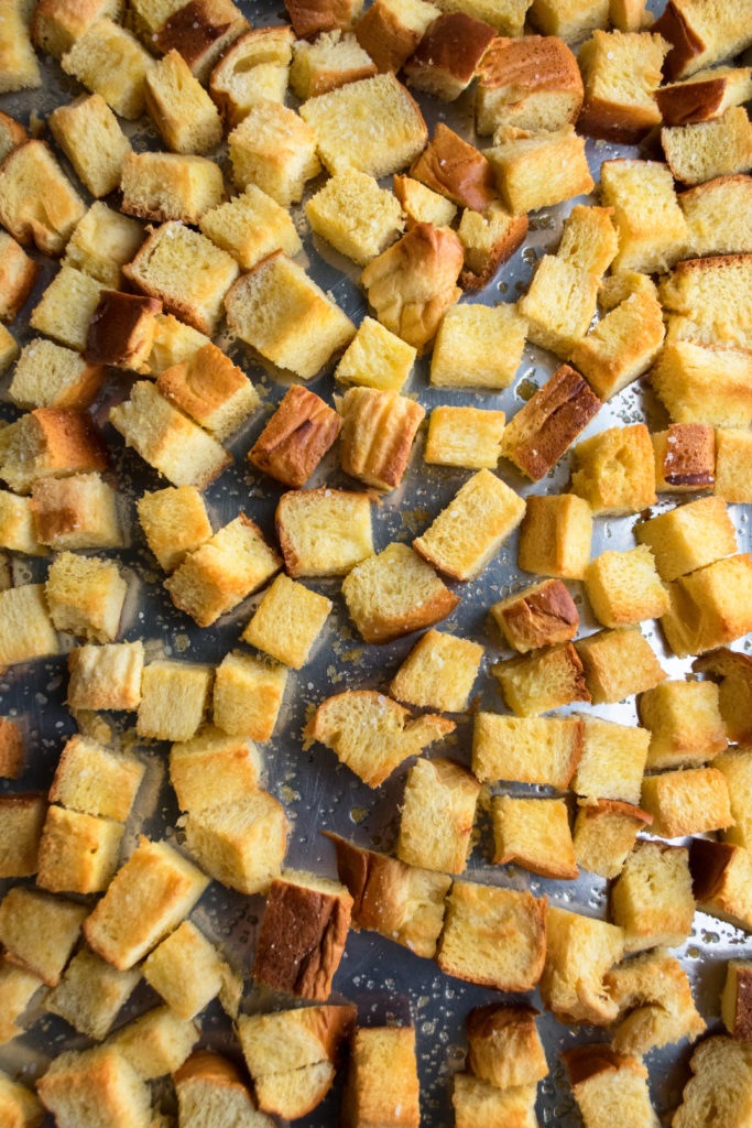 - Preheat the oven to 350°F. Add the cut brioche to a sheet pan and drizzle with olive oil. Toss well and spread into an even layer. Season with a pinch of salt. Bake for 12-15 minutes, until golden and crisp.