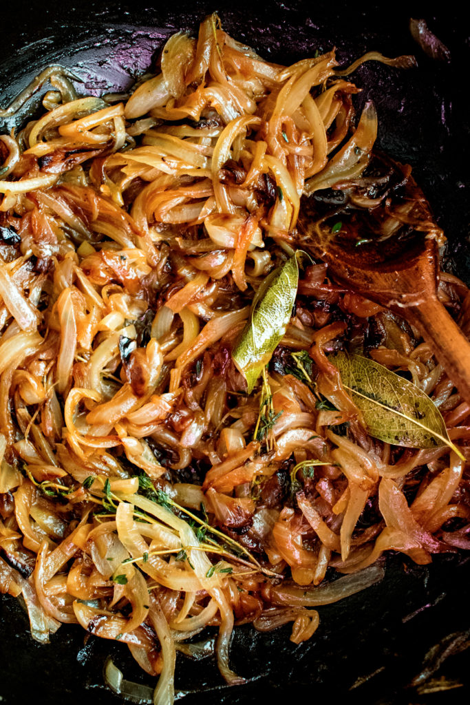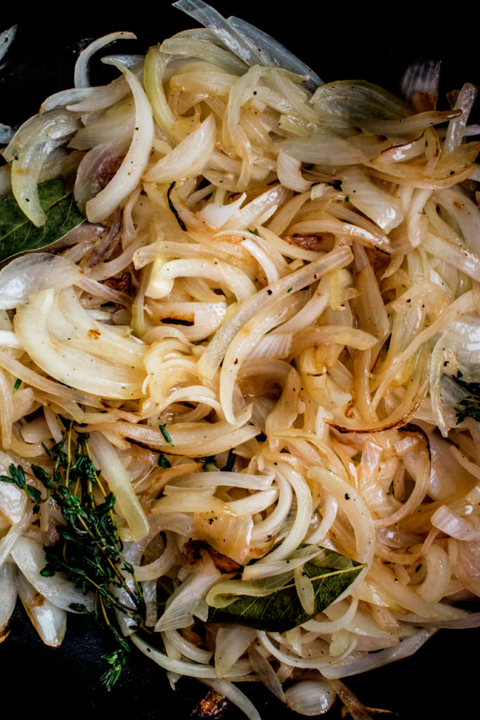 Onions cooked low and slow with all of the warm, inviting flavor of a french onion soup. Then piled on top of shredded gruyere and mozzarella cheeses (the gruyere being classic to the soup and adding lots of sharp, nutty flavor) and baked in a hot oven until golden and gooey.