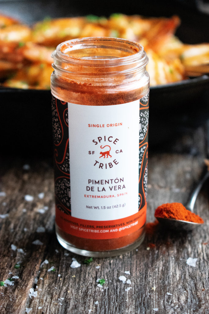 You’ll whip up the sauce in the same skillet by quickly caramelizing some shallots and garlic, adding in tomato paste for a deep, rich flavor, and then whisking in the smoked paprika. I’m using Spice Tribe’s authentic Pimentón De La Vera – a robust, smokey Spanish paprika that’s subtly sweet.