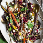 Easy roasted carrots with tahini pomegranate sauce – a flavorful mix of tahini, pomegranate molasses, lemon, and vinegar. Topped with creamy goat cheese, fresh pomegranate seeds, and lots of herbs. This is the very best recipe to throw together if you need an impressive side dish for entertaining, or just something really flavorful to spice up your weeknights!