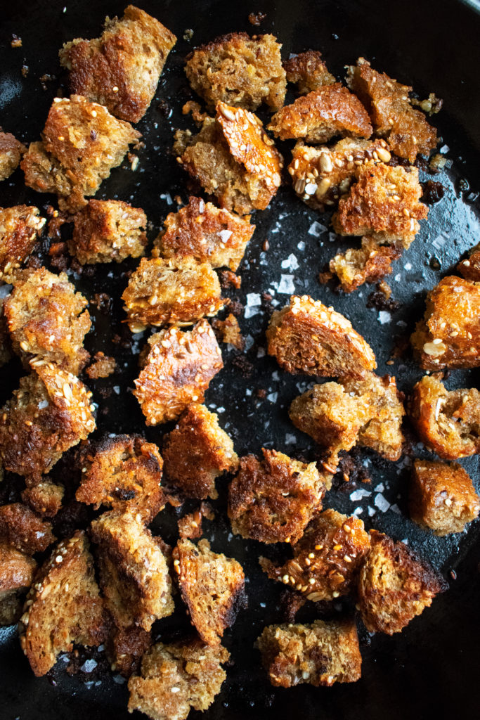 - Meanwhile, heat a large skillet over medium heat. Coat the bottom with a generous amount of olive oil. Once hot, add the torn bread. Toast until golden and crisp, stirring continuously. Season with a pinch of salt.