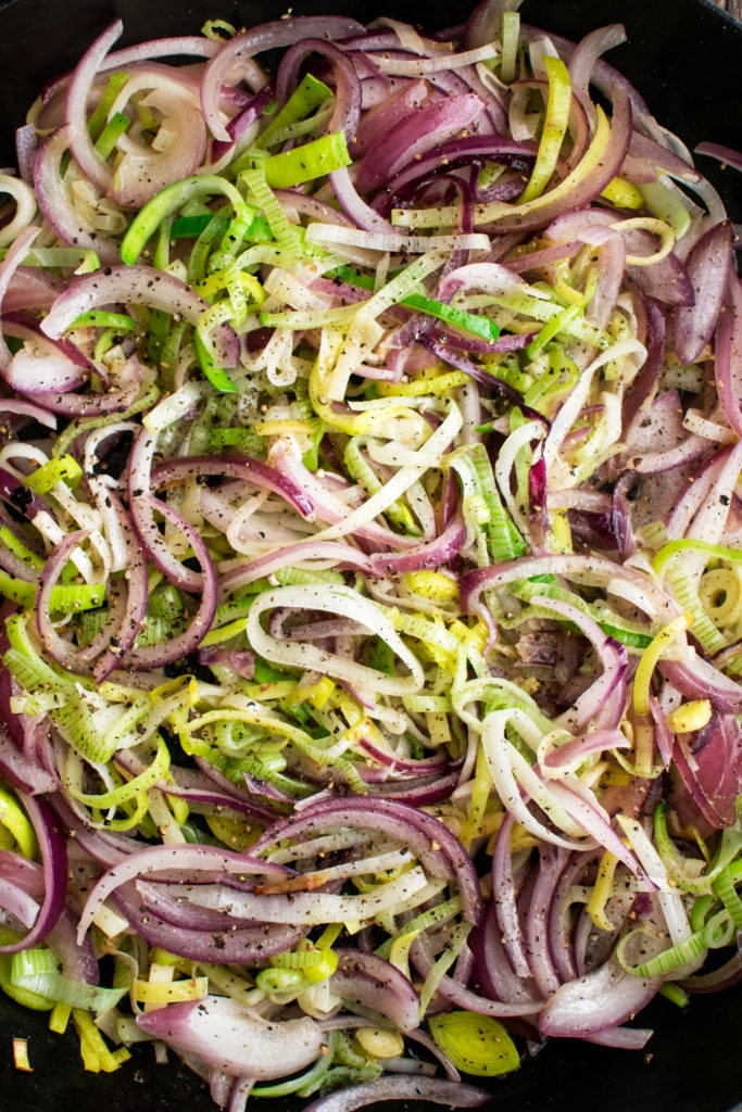 To prepare the leeks: Cut and discard the dark green tops. Trim the ends off. Thinly slice the light green/white sections. Place the sliced leeks in a colander and run under cold water, separating the layers as much as possible (a lot of dirt can be found within the layers). Drain and pat dry.