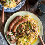 A plate of Irish bangers and colcannon mash for your St. Patrick’s Day feast! This is the ultimate festive meal, with juicy pan-roasted pork sausages and a side of mashed potatoes full of Irish cheddar, caramelized cabbage, and leeks. It’s one tasty recipe to whip up this weekend or next week for the holiday!