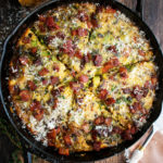 a simple brussels sprout frittata with caramelized onions, crispy bacon, and parmesan cheese