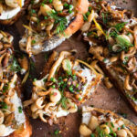 toasted bread topped with mascarpone cheese, pan-roasted mushrooms & shallots, and butter beans, flavored with lemon, balsamic, crushed red pepper, and herbs