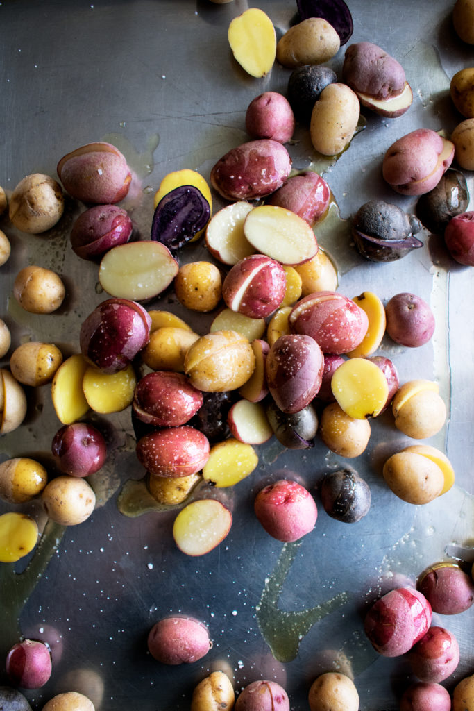 - Preheat the oven to 425°F. Add the potatoes to a half sheet pan. Drizzle generously with olive oil and season with salt and pepper. Toss to coat. Spread the potatoes into one even layer, cut-side down. Roast for 15 minutes.