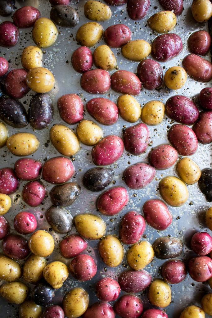 *Potatoes: If you can’t find pee wee potatoes, you can use fingerling potatoes cut in half. Follow the same process, but depending on the thickness of the potatoes, the roast time may vary.