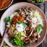 A fun weeknight dinner to keep things exciting: carnitas burrito bowl. A base of rice with homemade pork carnitas & black beans mounded over top, plus plenty of fresh toppings like a simple guacamole, cilantro-packed charred pepper salsa, cheese, radishes, and crisp lettuce. Just like ordering a burrito bowl out, you can customize this bowl however you’d like!