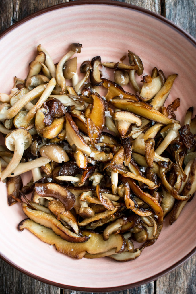 - Heat a 12” stainless steel skillet over medium-high heat. Add enough oil to generously coat the bottom. Once hot, add the mushrooms. Cook for 5-6 minutes until browned and tender. Transfer the mushrooms to a plate and season with a pinch of salt.