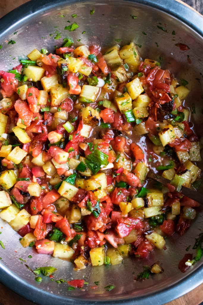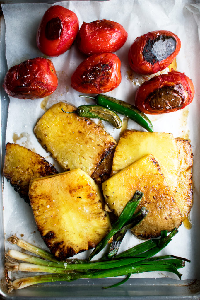- Grill until all of the ingredients are slightly charred and tender (about 3-4 minutes per side for the tomatoes and 2-3 minutes per side for the pineapple, green onions, and serrano). Transfer to a cutting board and let sit until cool enough to handle.