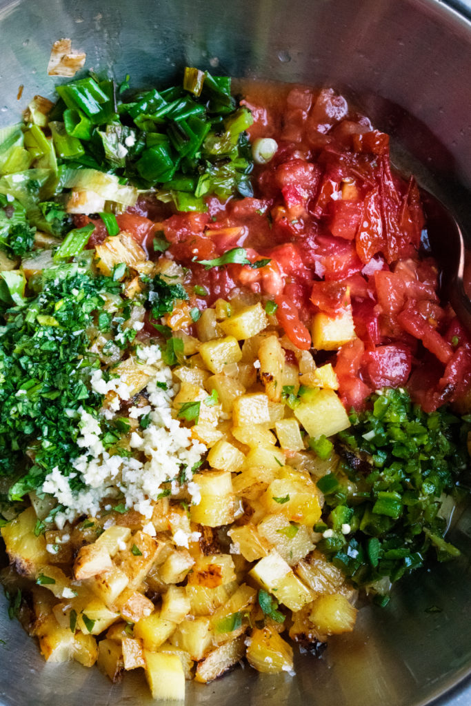 You’ll grill roma tomatoes, pineapple, green onions, and a serrano chile until slightly charred and tender, giving the salsa plenty of rich flavor to go along with the meat. A little garlic, cilantro, and lime juice are all you need to finish it off!