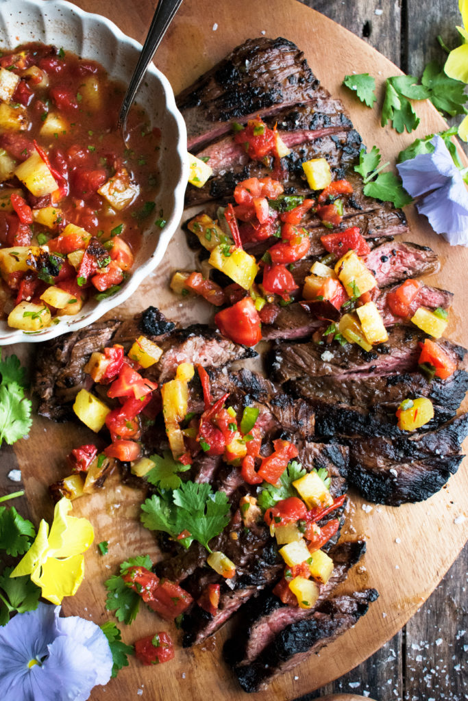 So to kick things off, I’m bringing you this mezcal-marinated skirt steak with grilled pineapple salsa!