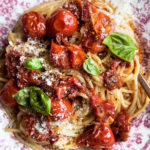 the simplest tomato confit spaghetti with basil & parmesan cheese