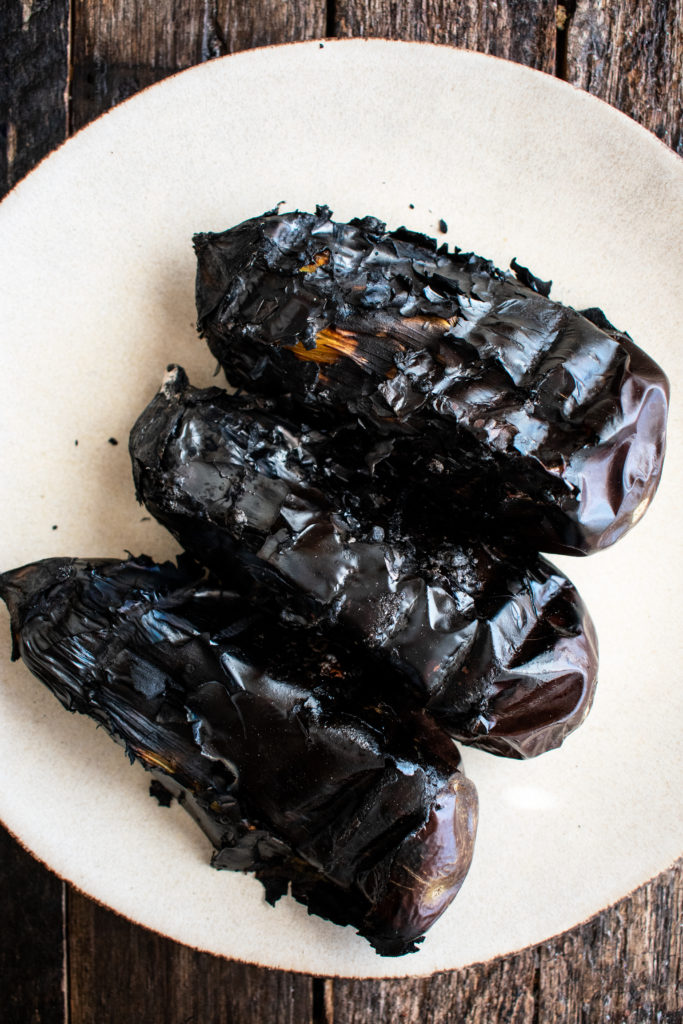 - Let the eggplant cool. Peel off the blackened skins (it doesn’t have to be perfect) and discard the stems.