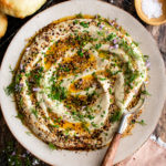 A smoky charred eggplant dip (or “baba ganoush”) drizzled with toasted sesame chili oil and fresh herbs. It’s an incredibly flavorful dip that makes for the perfect easy appetizer to a Mediterranean summer meal. Serve it with warm pita bread for dipping and a very generous drizzle of that chili oil!