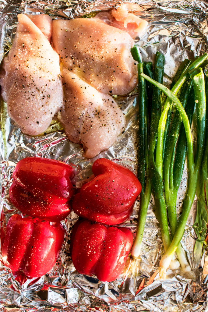 - Heat the grill over high heat. Coat the chicken, red peppers, and green onions in olive oil and season well with salt and black pepper. Grill the chicken and red peppers, covered, for about 6 minutes per side (or until slightly charred and cooked through) and the green onions for about 3 minutes per side.