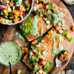 A fresh, healthy, and absolutely delicious summer dinner: green goddess salmon with peach salad. Simply seared salmon topped with a tangy, herby green goddess yogurt sauce and served with a sweet and refreshing salad alongside. All you need to do is add on some potatoes or rice and you’ve got an easy summer meal any night of the week.