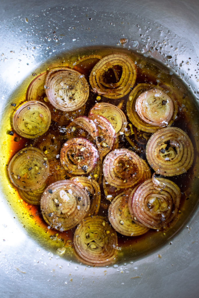 - Combine the shallots, balsamic vinegar, and ¼ cup of olive oil in a small mixing bowl. Season with a pinch of salt and a generous amount of freshly cracked pepper. Let the shallots sit, submerged, for about 15 minutes.