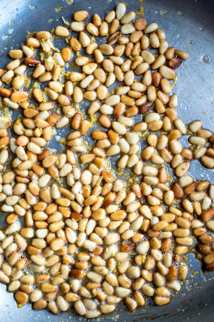 - Meanwhile, heat a skillet over medium heat. Add the remaining tablespoon of olive oil. Once hot, add the pine nuts. Turn the heat to low and toast for just about 30 seconds (watch so they don’t burn), or until golden. Turn off the heat. Stir in the lemon zest and a pinch of salt.