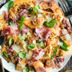 From there, it’s all about the assembly. Start with the cantaloupe (honeydew melon would be great, too), then arrange the prosciutto in all of the empty spaces on the platter. A few final touches give this dish a final pop of flavor – salty parmesan cheese, fresh basil, those tangy shallots, and the zesty pine nuts. SO delicious when combined all together.