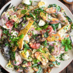 A fun twist on the classic summer side dish: grilled pepper potato salad with creamy mustard dressing. Full of sweet & spicy peppers, crispy potatoes, hard-boiled eggs, green onions & radishes, and lots of fresh herbs. If you need a side dish for any end of summer cookouts…this is it!