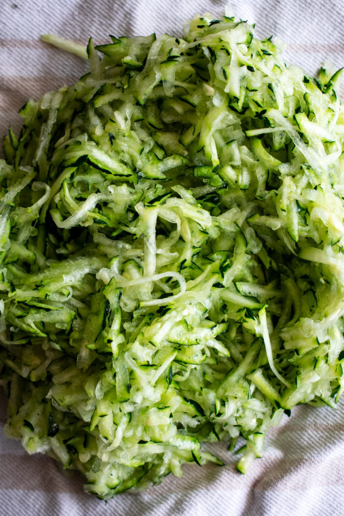For the zucchini, simply shred it using a box grater. Once you have your 2 cups worth, you’ll want to use a kitchen towel to help ring out some of the excess liquid. This is key to prevent soggy bread. You don’t have to get absolutely all of the liquid out, but a few really good squeezes and turns will do.