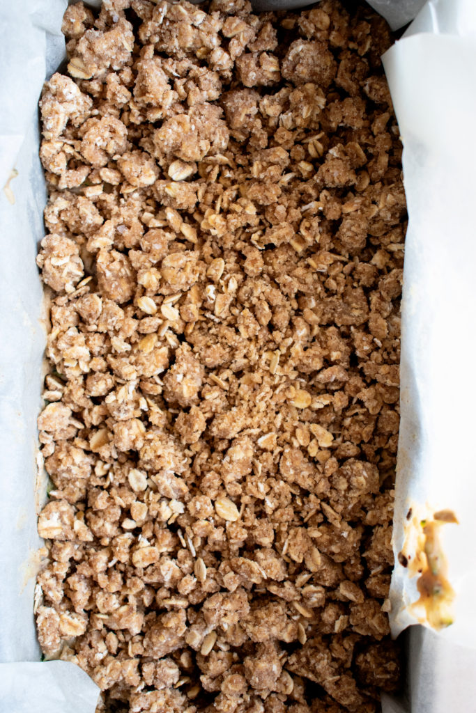 - For the oat streusel, add the oats, all-purpose flour, brown sugar, cinnamon, and salt to a small bowl. Toss to combine. Add the cubed butter and use your fingers (or a pastry cutter) to “rub” the butter into the flour. Keep working it in until the flour has been absorbed and the mixture resembles coarse crumbs. Top the batter with the streusel.