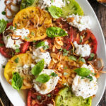 The simplest dish to savor the end of summer: tomatoes & burrata with crispy shallot vinaigrette. Beautiful heirloom tomatoes, creamy burrata cheese, crispy shallots & garlic, a really flavorful vinaigrette, and lots of fresh herbs. Serve it with toasted bread alongside for the most show-stopping appetizer or side dish. It’s a unique take on a simple tomato salad that you can serve with just about any summer meal!