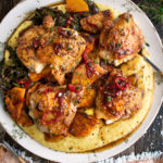 A dinner full of flavor to add to your rotation: spicy maple glazed chicken with cheddar polenta. Chicken thighs pan-seared in a skillet until crisp and juicy, then coated in a really flavorful sweet and spicy glaze, and served over creamy white cheddar polenta with caramelized butternut squash & wilted greens alongside. It’s a meal that’s every bit as delicious as it is satisfying.