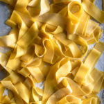 - Gently fold the sheets of dough and then cut them into ½” pieces, creating long strands of pasta. Separate the strands of pasta. Cook in boiling, salted water for about 3 minutes.